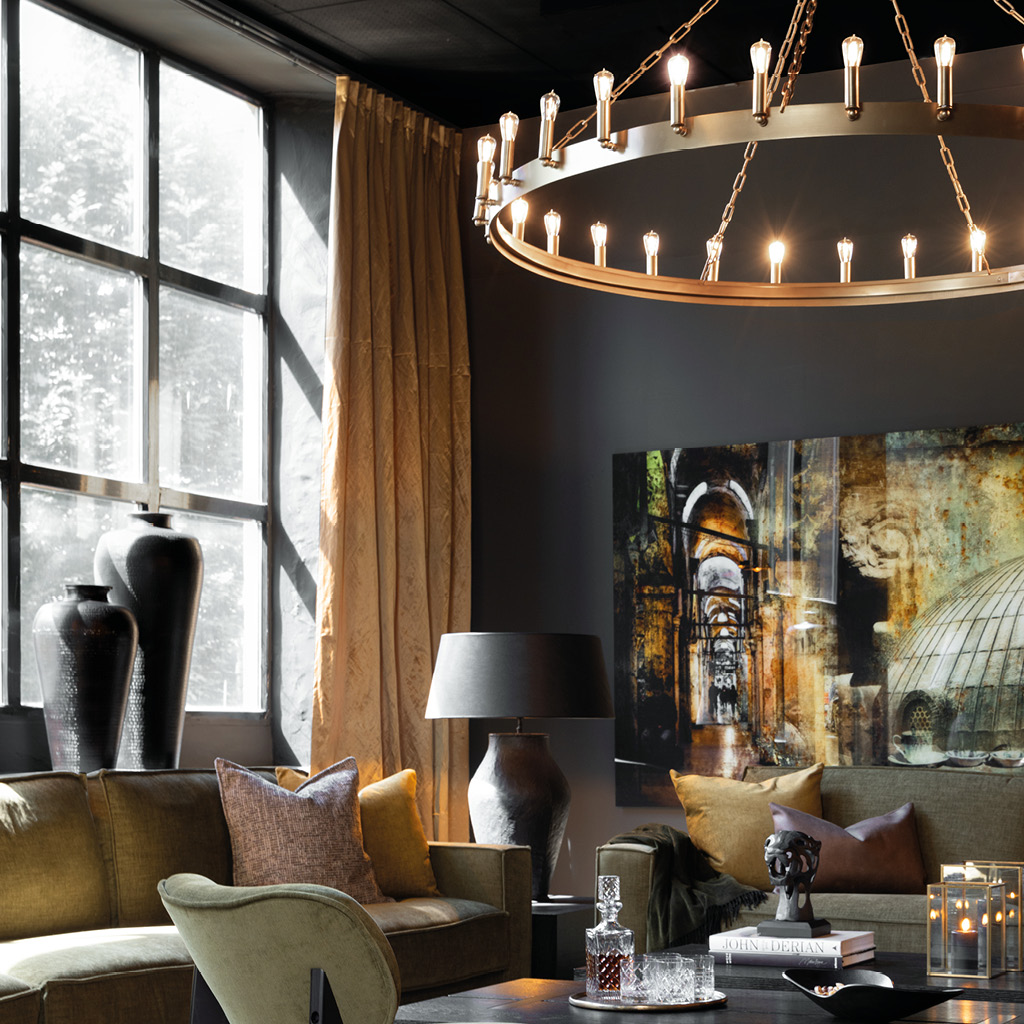 En exklusiv, maffig ljuskrona som Antler Chandelier skapar den rätta, lyxiga känslan. Takkronorna Crown eller Khan ger samma rustika, pampiga intryck. Lägg också till mindre lampor, gärna dimbara med varmt sken. Ett normalstort rum mår bra av minst 5 ljuskällor; tak-, golv- och bordslampor. Levande ljus i lyktor och ljusstakar adderar mysfaktor – använd gärna doftljus med doft av till exempel ceder eller gran.