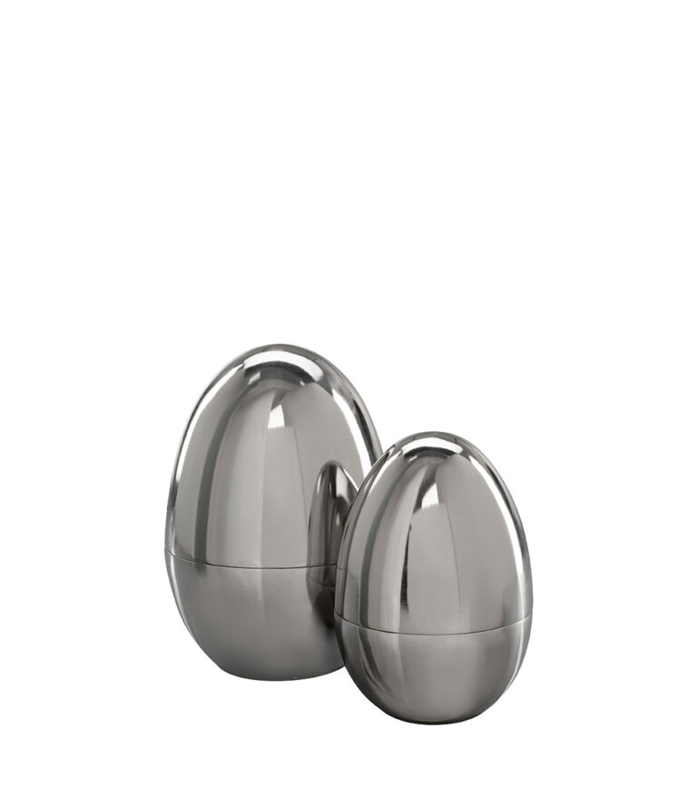 2-pack decorative openable metal eggs in silver. Made entirely of high-quality metal, these versatile eggs are perfect for storing small treasures or simply adding elegance to any room. The shiny finish provides a luxurious and modern look, making them an ideal addition to both contemporary and classic interiors.