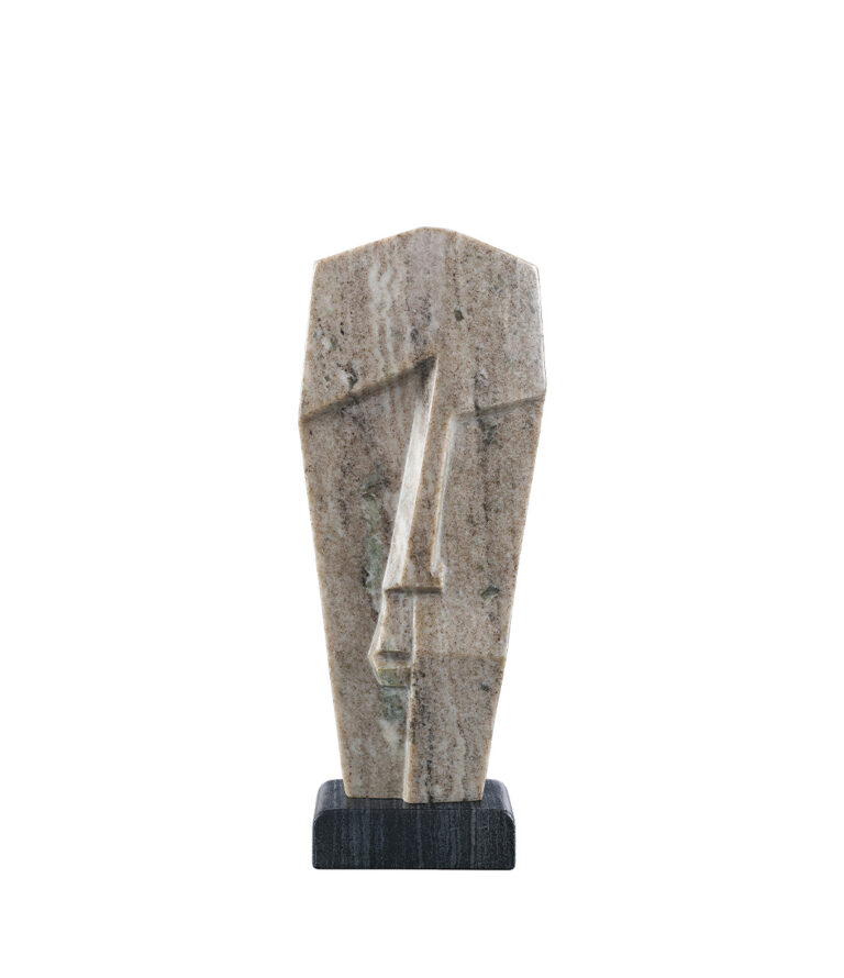 A stylish decorative sculpture shaped like an abstract face, crafted from exclusive beige/grey marbled marble. The natural variations in the stone make each piece unique, and the sculpture rests on an elegant black marble base that creates a beautiful contrast. A modern and artistic interior accent that elevates any room with its natural weight and refined character.