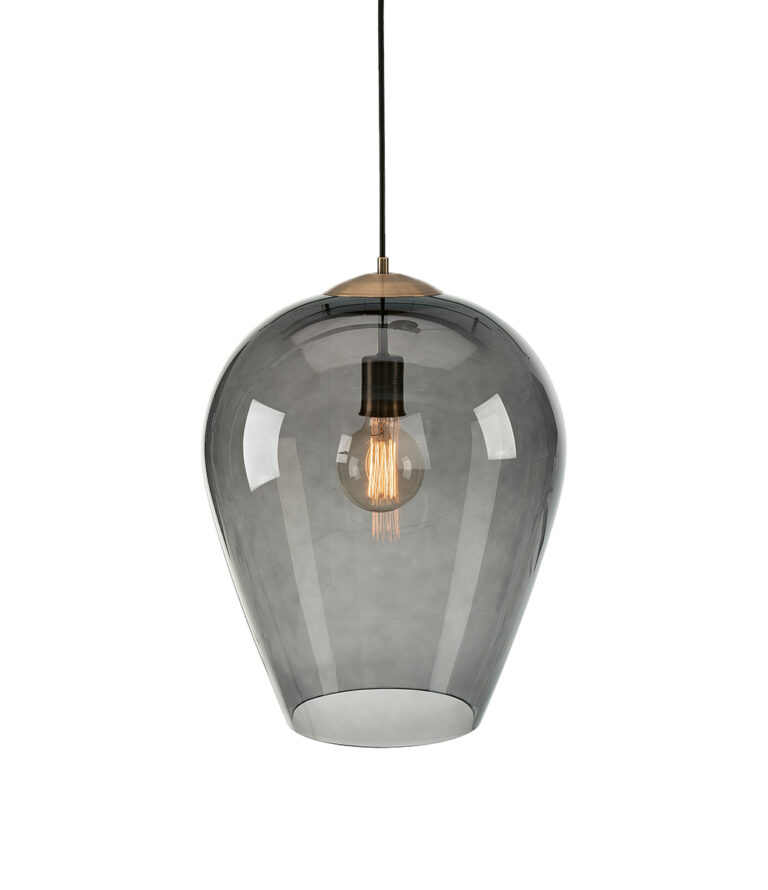 Ceiling lamp in smoky gray glass and metal with a drop-shaped design, perfect as a pendant lamp. The cable length is 120 cm. The handmade glass may have slight imperfections that create a beautiful light reflection, making each lamp unique. Small variations may occur, adding to its charm and originality.