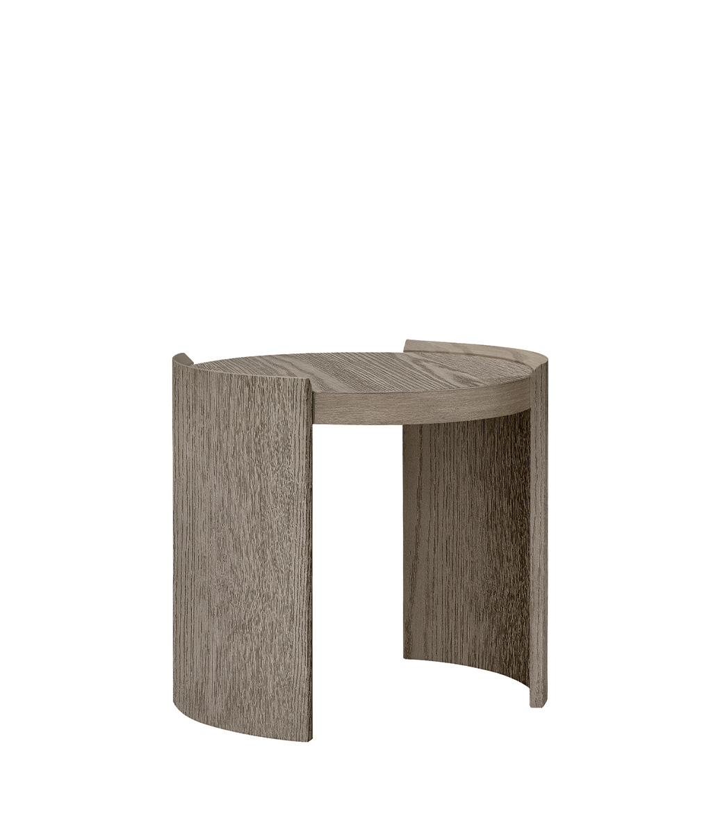 Elegant round side table in oak veneer with two sturdy side panels, creating a unique and sleek design. The tabletop features a beautiful natural wood grain that highlights the warm tones of the oak, adding a touch of exclusivity. The two side panels act as legs, giving the table a modern, airy look while ensuring stability and durability.