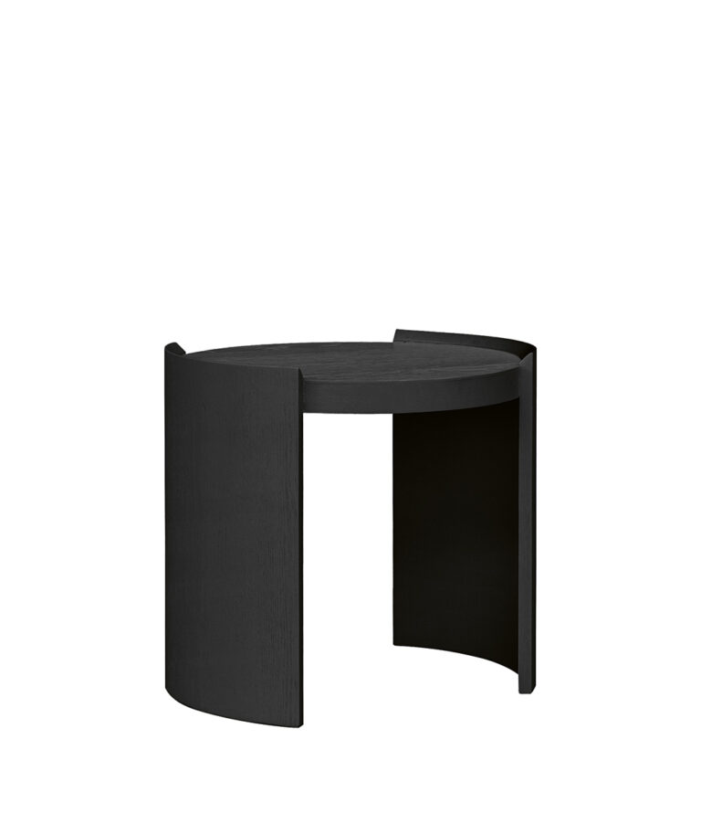 Elegant round side table in oak veneer with two sturdy side panels, creating a unique and sleek design. The tabletop features a beautiful natural wood grain that highlights the warm tones of the oak, adding a touch of exclusivity. The two side panels act as legs, giving the table a modern, airy look while ensuring stability and durability.
