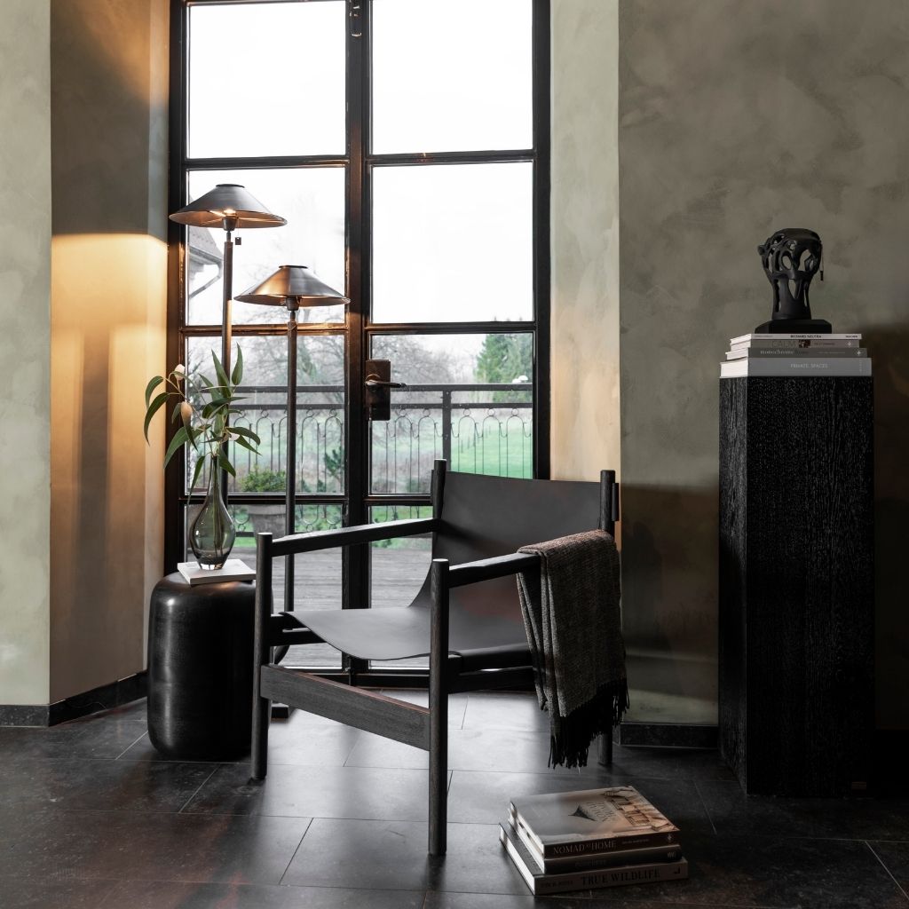 Jordan is a modern lounge chair with a sleek frame and legs in graphite-coloured beech, combined with a seat in high-quality leather. Its open, sculptural design creates an exclusive expression and makes it an elegant statement piece in both living rooms and lounge areas. A timeless favourite that blends comfort, craftsmanship, and refined form.