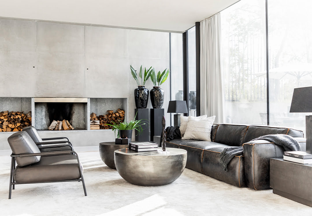 När du vill inreda vardagsrummet modernt och maskulint med en rå känsla, samtidigt som det omfamnar naturliga kurvor. Den monokroma färgpaletten förstärker den maskulina känslan. Aluminiumbord i gedigna spännande former, en pampig soffa i läder och kuddar i texturer som linne med råa kanter.
