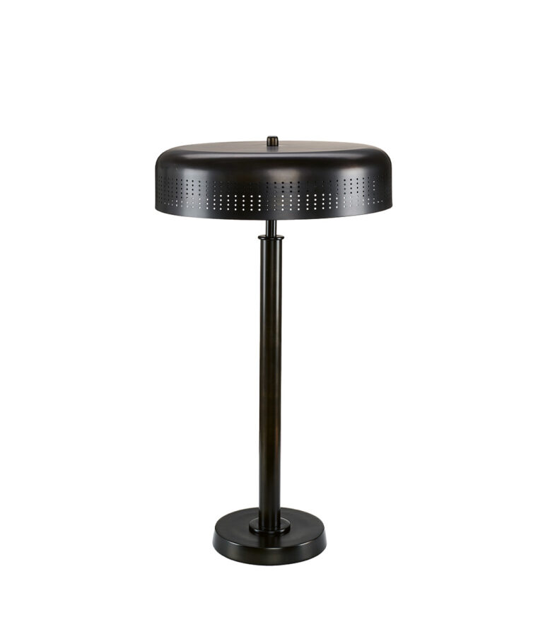 Stilren bordslampa i metall med bronzefinish och dekorativ hålmönstrad skärm – ett perfekt val för att lyfta inredningen på skrivbordet, sidobordet eller i fönstret. Den blanka ytan reflekterar ljuset vackert och skapar en varm, inbjudande atmosfär.