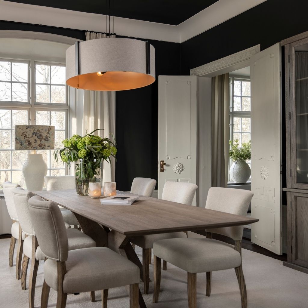 Taklampa i pendelmodell med skärm i strukturvävt tyg och svart metallram, som ger en ombonad men samtidigt modern känsla. Med plats för fyra ljuskällor skapar den en stämningsfull belysning. Denna stilrena lampa passar perfekt i de flesta rum i ditt hem, från vardagsrum till sovrum och kök. Vajer/kabellängd: 300 cm (justerbar).