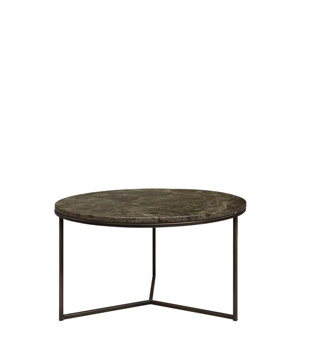 Ett runt soffbord med marmorskiva och underrede i bronsfärgad metall. Bordsskivan, tillverkad av högkvalitativ marmor, ger en lyxig och naturlig känsla med unika mönster som gör varje bord helt unikt. Det stabila underredet med tre ben i en varm bronsfinish kompletterar marmorns elegans och tillför en modern touch.
