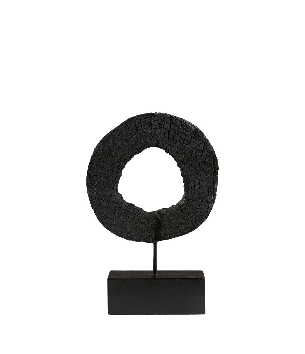 Cirkelformad staty tillverkad av bränt mangoträ, monterad på en robust metallfot. Varje staty är unik i sitt utseende, vilket gör den till ett enastående tillskott i din inredning. Den distinkta brända ytan, kombinerad med den eleganta cirkelformen, skapar en perfekt balans mellan naturens råa skönhet och modern design.