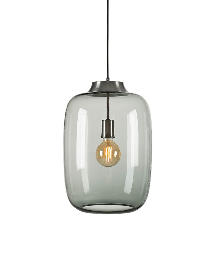 Taklampa i gråfärgat glas och metall med en något oval form, perfekt som pendellampa. Kabellängd är 120 cm. Det handgjorda glaset kan ha små ojämnheter som skapar en vacker ljusreflektion, vilket gör varje lampa unik. Små avvikelser kan förekomma, vilket bidrar till dess charm och originalitet.