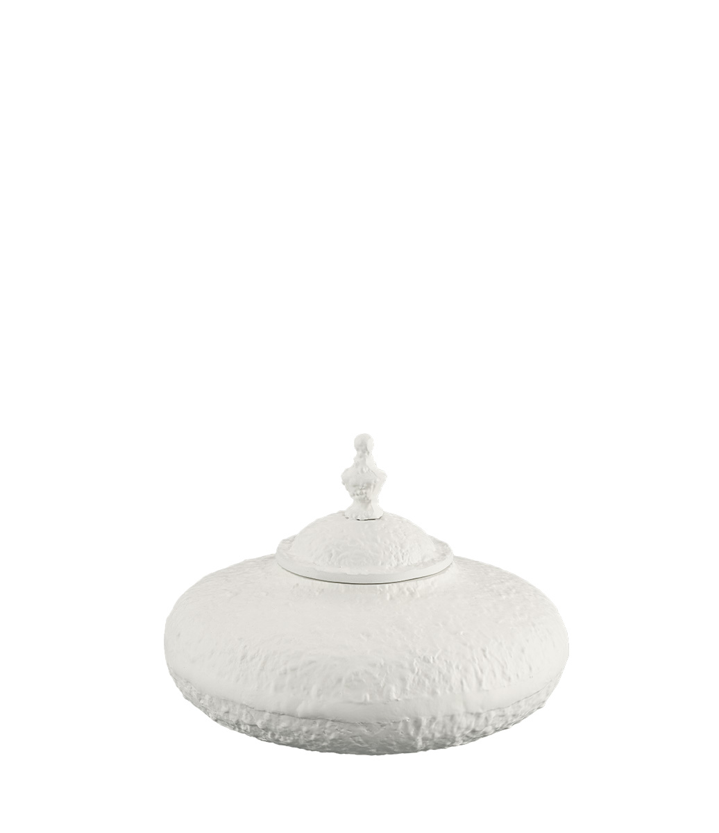 Rund dekorationsask i metall med lock. Strukturerad yta.