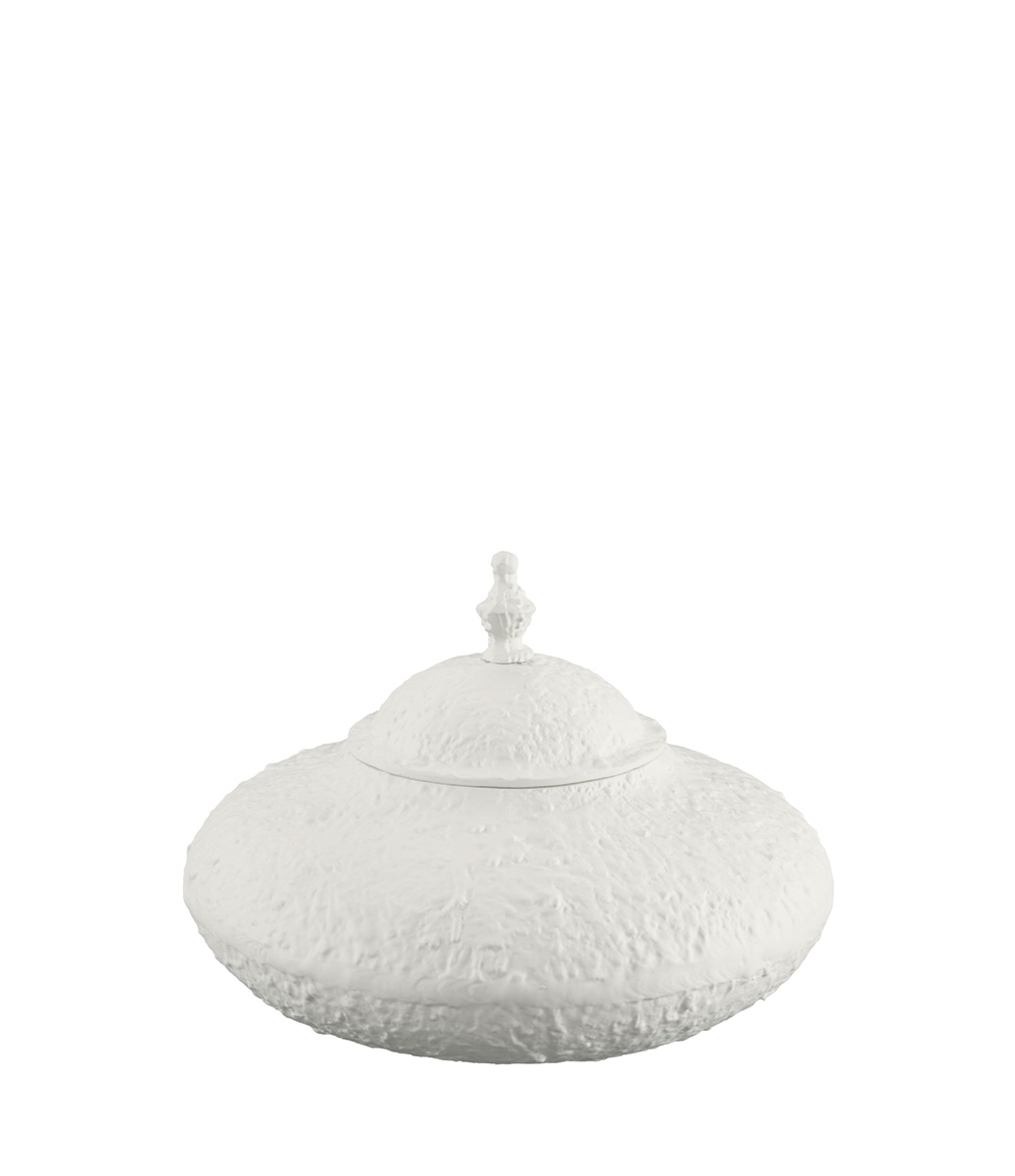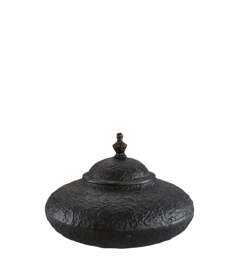 Rund dekorationsask med lock i metall. Strukturerad yta.