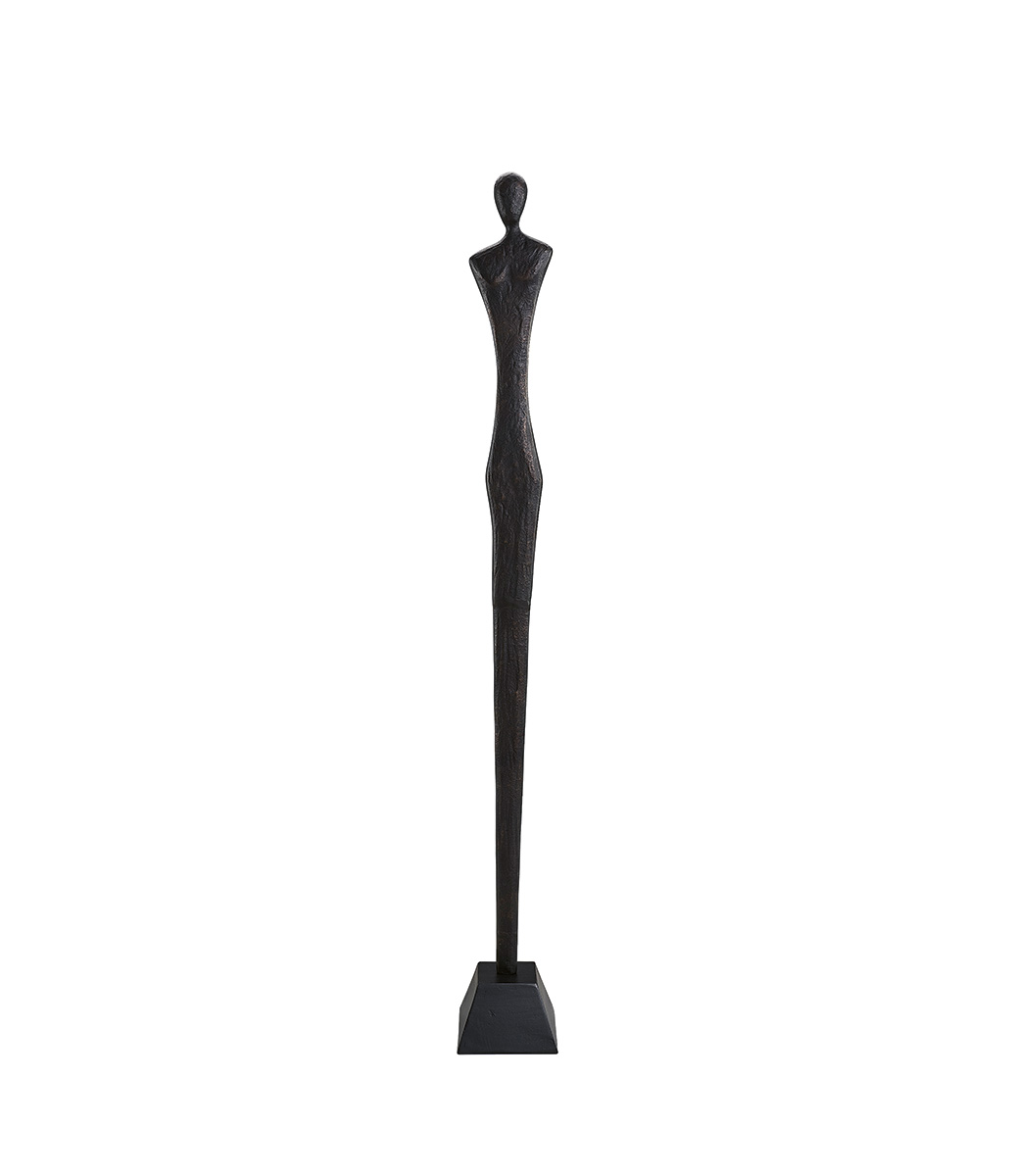 DONNA är en stilfull golvstaty i silhuetten av en kvinna. Den är tillverkad av matt metall med en strukturerad yta. Dess minimalistiska design och rena linjer skapar en modern, konstnärlig känsla som kompletterar alla interiörer. Perfekt för att tillföra en touch av sofistikering till ditt hem eller kontor.