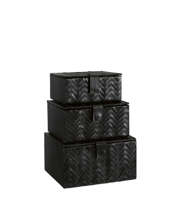 3-pack förvaringsboxar i olika storlekar, tillverkade med en robust trästomme och klädda i stilfullt fiskbensmönstrat läder. Varje box är försedd med ett praktiskt knäppe för säker stängning. Dessa boxar kombinerar funktionalitet med sofistikerad design och är perfekta för att organisera dina småsaker samtidigt som de tillför en lyxig touch till din inredning. Placera dem tillsammans för en harmonisk förvaringslösning eller var för sig för att skapa flera iögonfallande detaljer i ditt hem.