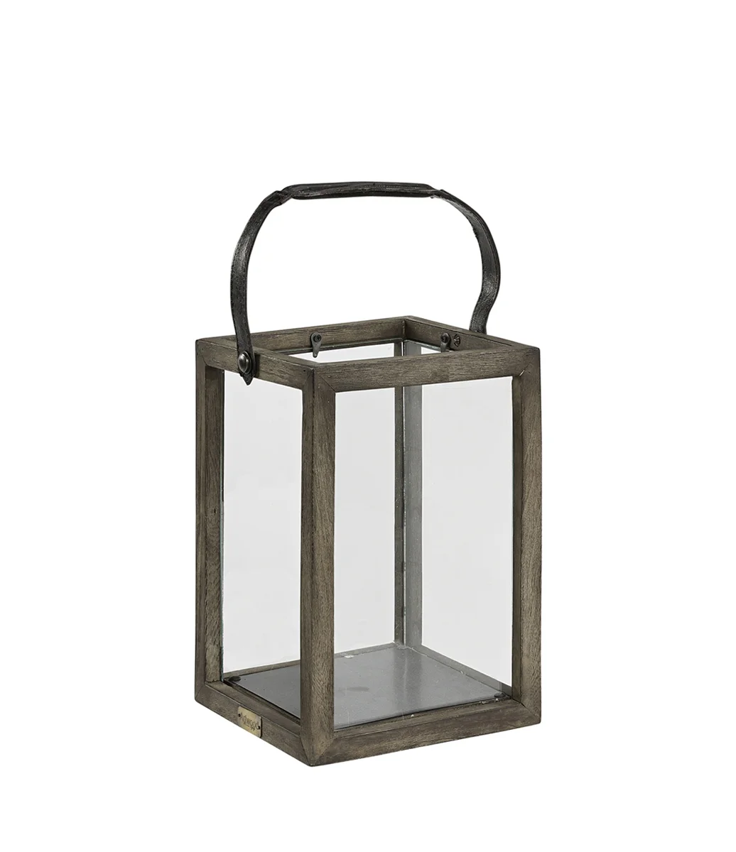Lykta tillverkad av Java oak och glas, utrustad med ett elegant läderhandtag för enkel förflyttning. Perfekt för att skapa en varm och inbjudande atmosfär i hemmet.