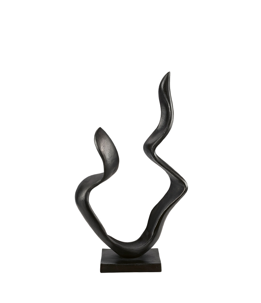 Elegant skulptur i svart metall med fot. Ett iögonfallande dekorationsföremål som tveklöst drar uppmärksamhet till sig med sin höjd och enkla design. Dess minimalistiska charm gör den till ett perfekt tillskott på ett bord, fönsterbräde, en skänk eller hylla.