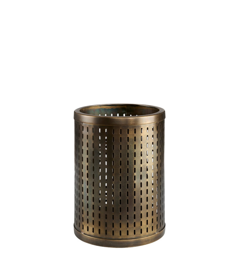 Denna eleganta lykta i perforerad metall sprider ett mjukt och levande ljusspel när du placerar ett värmeljus eller LED-ljus inuti. Den antikbehandlade mässingstonen ger ett varmt uttryck och en tidlös känsla, perfekt för att skapa en inbjudande atmosfär i hemmet.