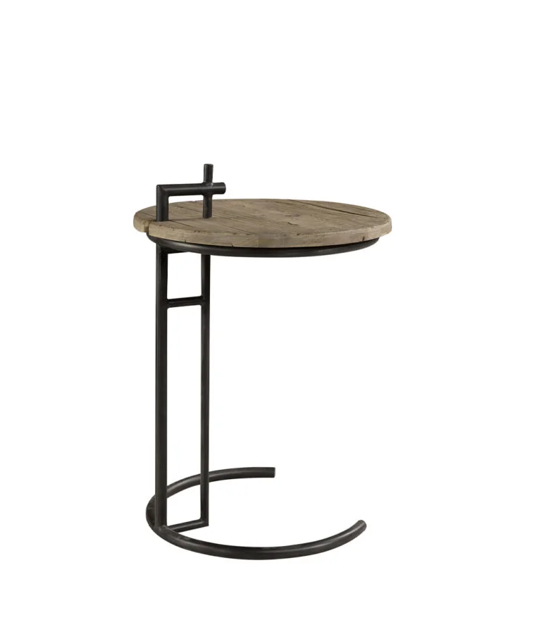 Ett sidobord som förenar rustik charm och modern elegans. Den vintageinspirerade träskivan i alm har en vacker patina som ger en varm och inbjudande känsla, medan det robusta metallunderredet skapar en luftig och stilren kontrast.